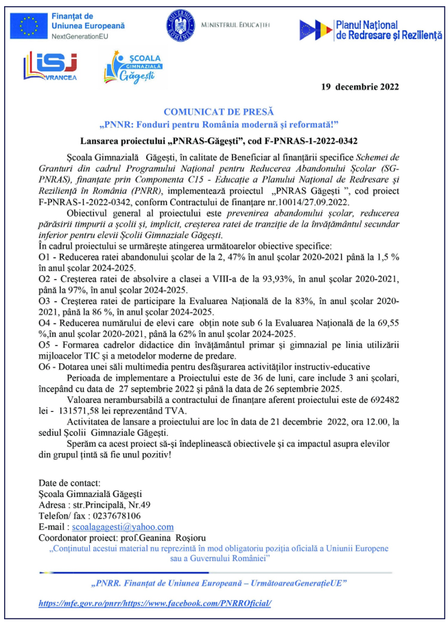 1.2.1. Activități de promovare (întâlnire de lansare a proiectului și seminarii de informare) și diseminare a rezultatelor proiectului COMUNICAT DE PRESĂ ÎNTÂLNIRE DE LANSARE A PROIECTULUI ANUNȚ DESCHIDERE PROIECT (LANSARE) – PROGRAMUL NAȚIONAL PENTRU REDUCEREA ABANDONULUI ȘCOLAR SEMINAR DE INFORMARE ȘI DISEMINARE A REZULTATELOR PROIECTULUI SEMINAR DE INFORMARE ȘI DISEMINARE A REZULTATELOR PROIECTULUI – IANUARIE 2025